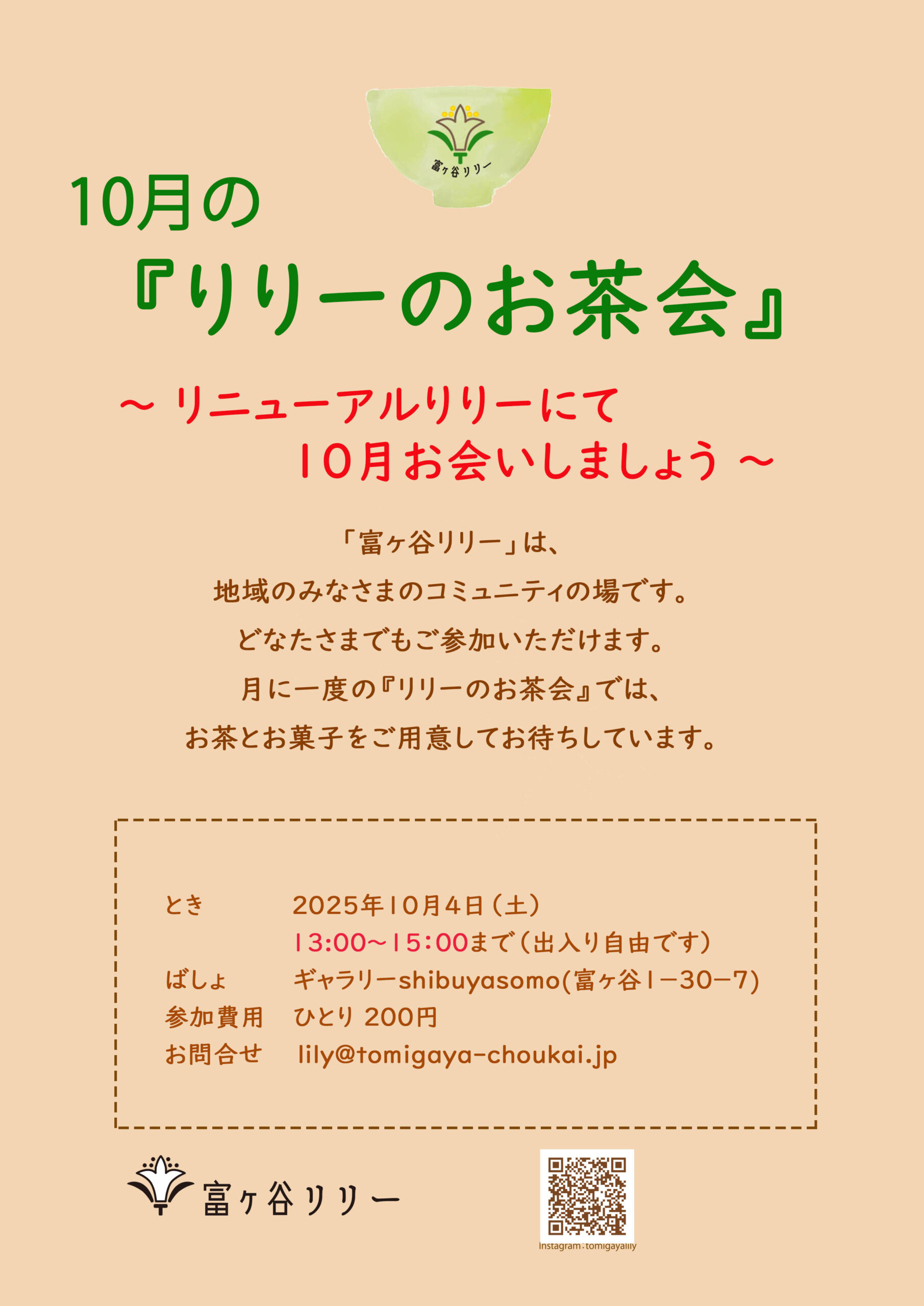 10月のりりーのお茶会 〜リニューアルりりーにて10月お会いしましょう〜 2025/09/21 ■問い合わせフォーム、またはLINE・メールでお気軽にご連絡ください。 Instagram:tomigayalily mail:lily@tomigaya-choukai.jp