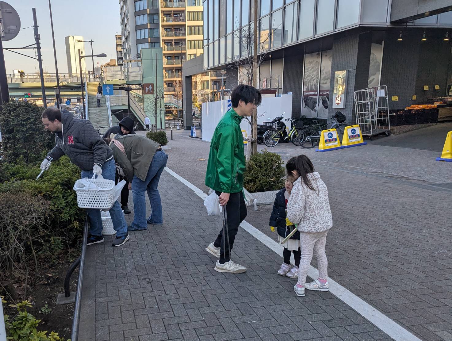 お父さんが植え込みの中からトングで取り出したごみを歩道側に置